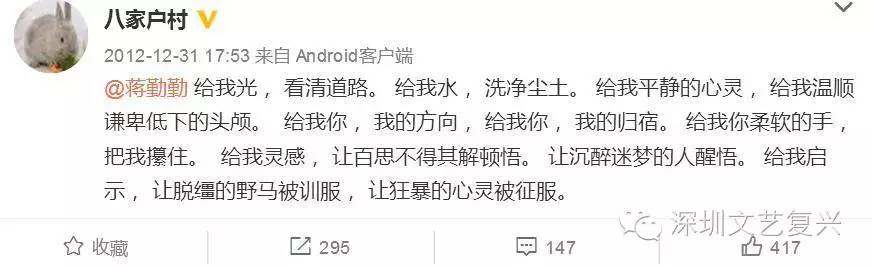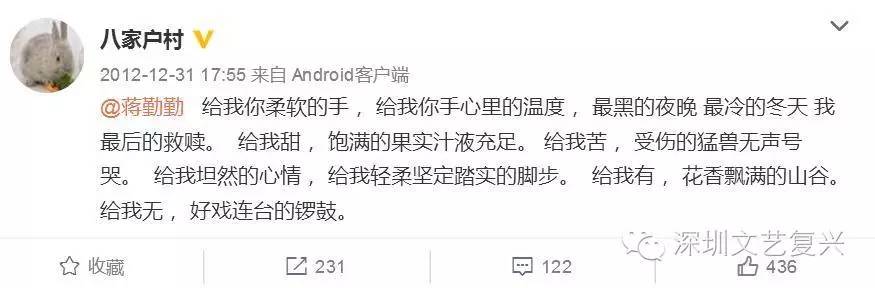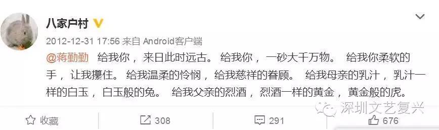 微博名叫“八家戶村”,因為那是他在新疆的故鄉。