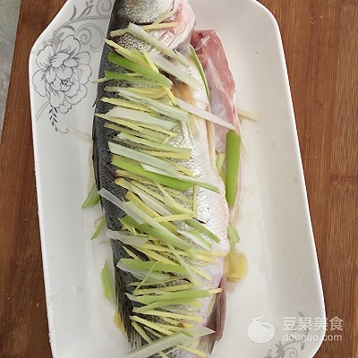 2、準備切姜和蔥絲,放入魚肚里和魚表面,燒開水,把魚盤放入鍋里中火蒸12分鐘,不要蒸久了,肉質就不嫩了,蒸好后將汁液倒掉后,去掉表面的姜絲,重新放上蔥絲,倒上蒸魚豉油
