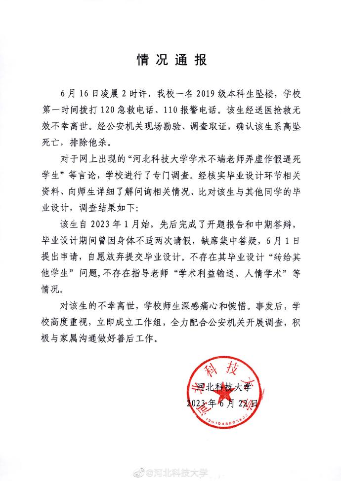導讀來源河北科技大學 視頻加載中...情況通報6月16日凌晨2時許,我校一名2019級本科生墜樓,學校第一時間撥打120急救電話、110 報警電話。該生經送醫搶救無效不幸離世。經公安機關現場勘驗、調查取