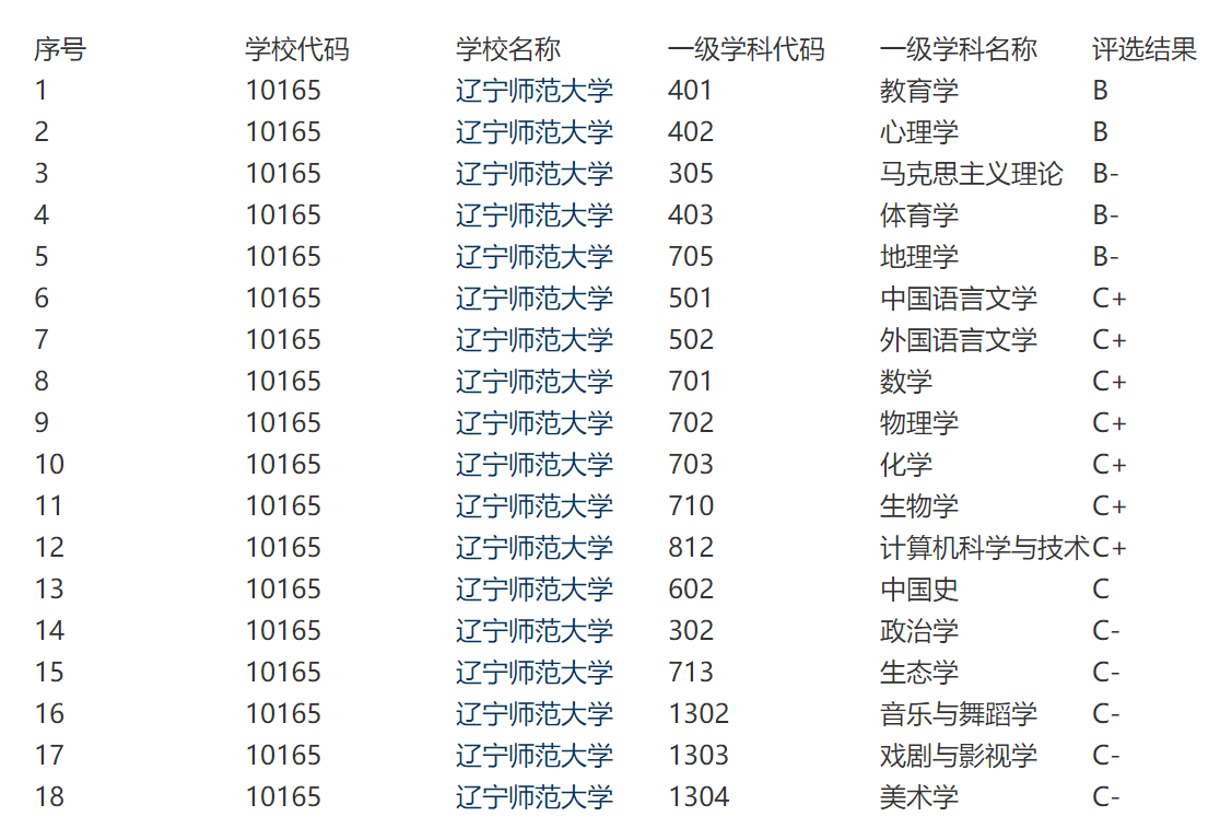 遼寧師范大學在教育部的第四輪學科評估中,一共有18個學科參評,同樣沒有A類學科。教育學、心理學、馬克思主義理論、體育學、地理學等5個學科獲評B類,中國語言文學、外國語言文學、數學、物理學等13個學科獲評C類。