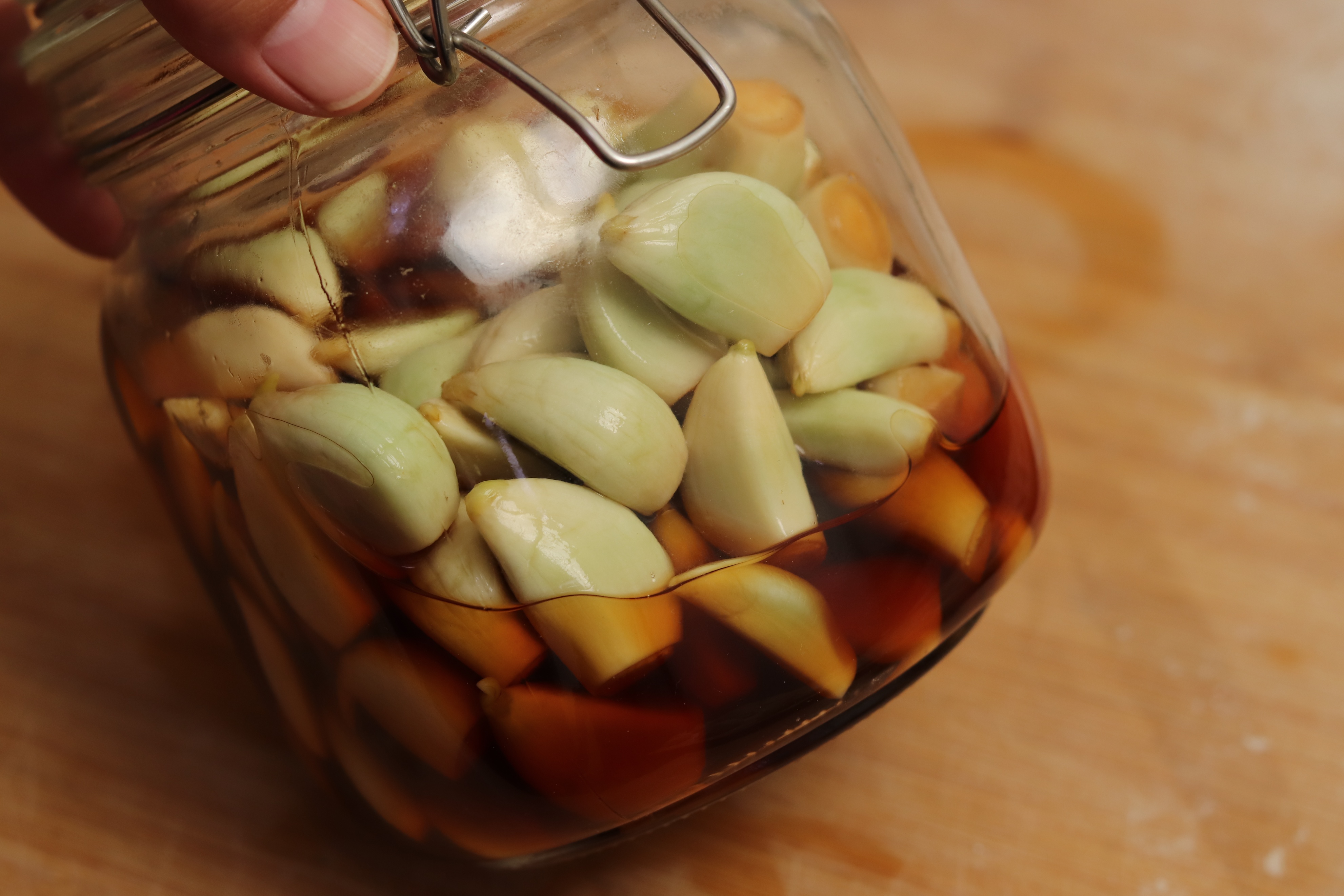 6、腌臘八蒜:將處理好的大蒜裝入玻璃罐子中,不要裝的太滿,再將熬好的糖醋汁倒進來,醋的量剛好沒過大蒜就可以了,罐子要留有空隙,腌制的過程中會出現膨脹的現象,最后蓋上蓋子密封好,給它放到溫度比較低的地方,腌制2天就開始變綠了,基本上一周左右蒜瓣變的通體翠綠。