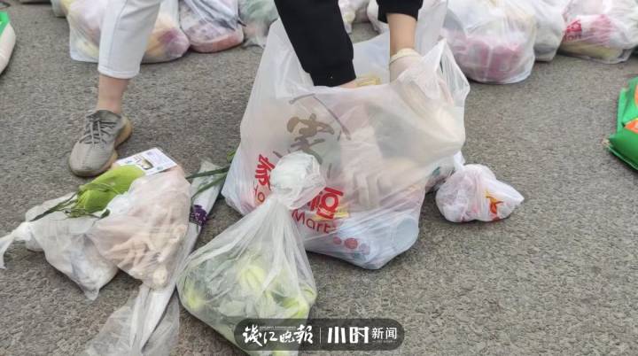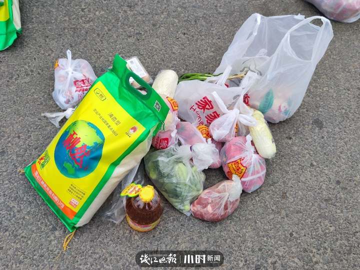 “我們將所有東西裝成一大袋,里面有雞蛋、青菜、帶魚、鯧魚、雞爪、雞翅、水果、八寶粥、金針菇、辣椒、娃娃菜,還有肉類和咸鴨蛋。除外,每家每戶還有一袋大米、一瓶食用油和一袋鹽。”現場工作人員告訴記者,物資中不光有生活必需的米和油,還有品類豐富的禽肉蔬菜等。