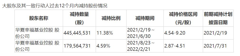 以2021年2月19日-2022年2月21日的12個月來看,華夏控股及其一致行動人共減持華夏幸福15.97%,減持價格區間每股在2.87-9.2元。