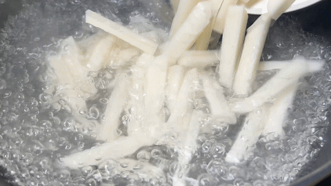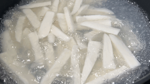 1、 將真空的年糕改刀切成長條,然后焯水煮5分鐘左右控水撈出