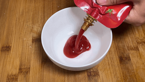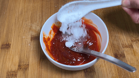 3. 在一個碗中倒兩勺番茄醬,加入兩勺韓式辣椒醬