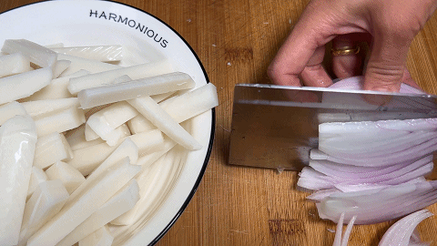 年糕是買的真空包裝的那種,不易腐爛發霉,可終年食用。年糕是糯米制成的,黏性強,所以在切的時候很有講究哦。今天的韓式炒年糕做法很簡單,一起看一下是怎么做的吧。