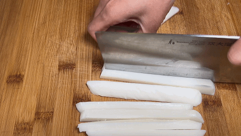 1. 將真空包裝的年糕,改刀切成條形,實在是不好切,可以選擇直接買條狀的年糕