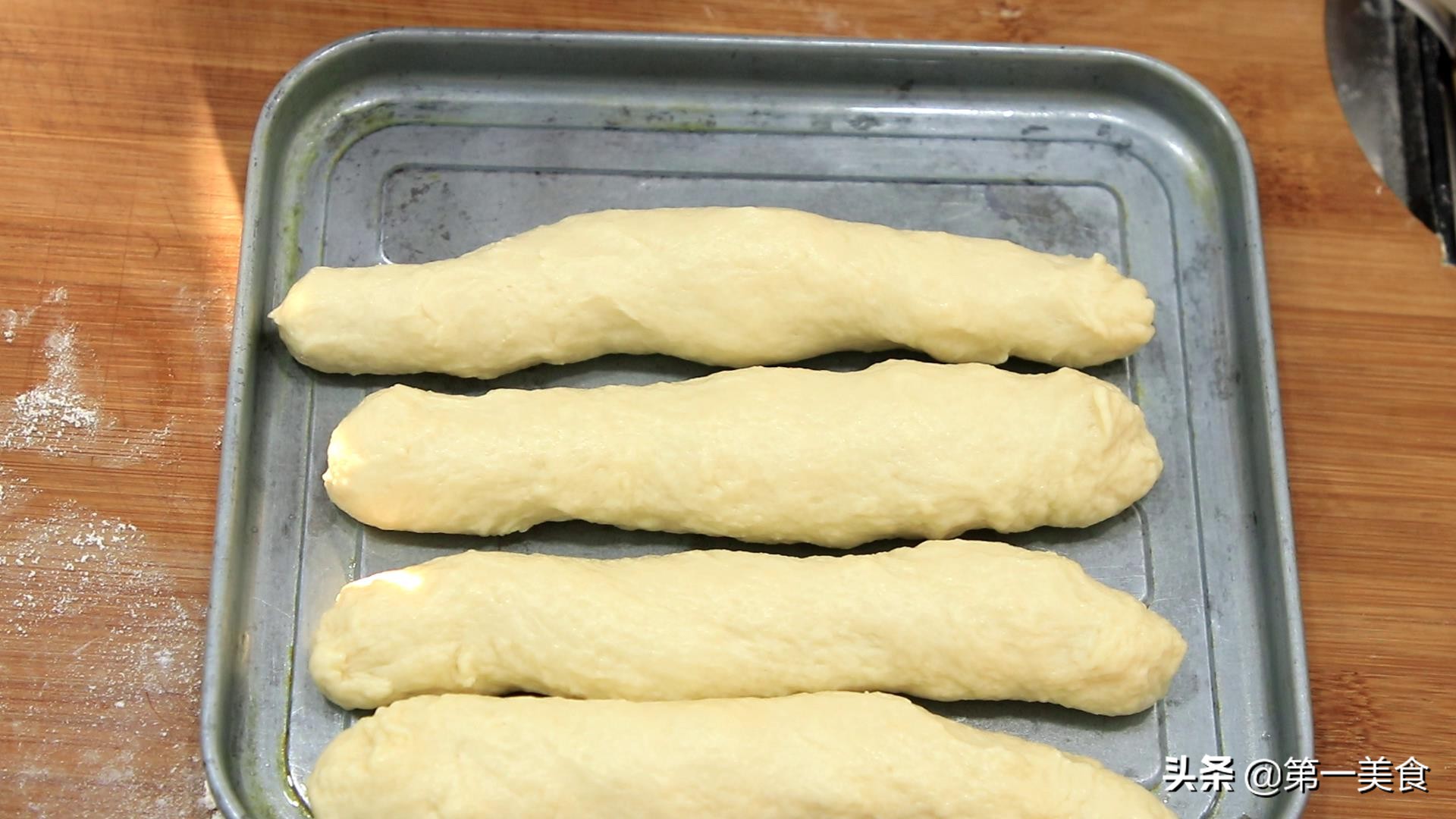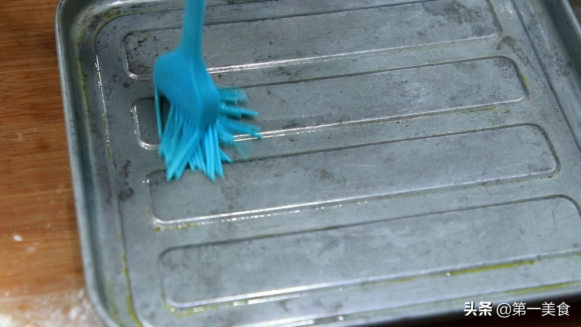 搓揉好以后, 用手抓一個面劑子,搓成一個長條 ,放在烤盤中,烤盤的底部要刷上一層植物油。