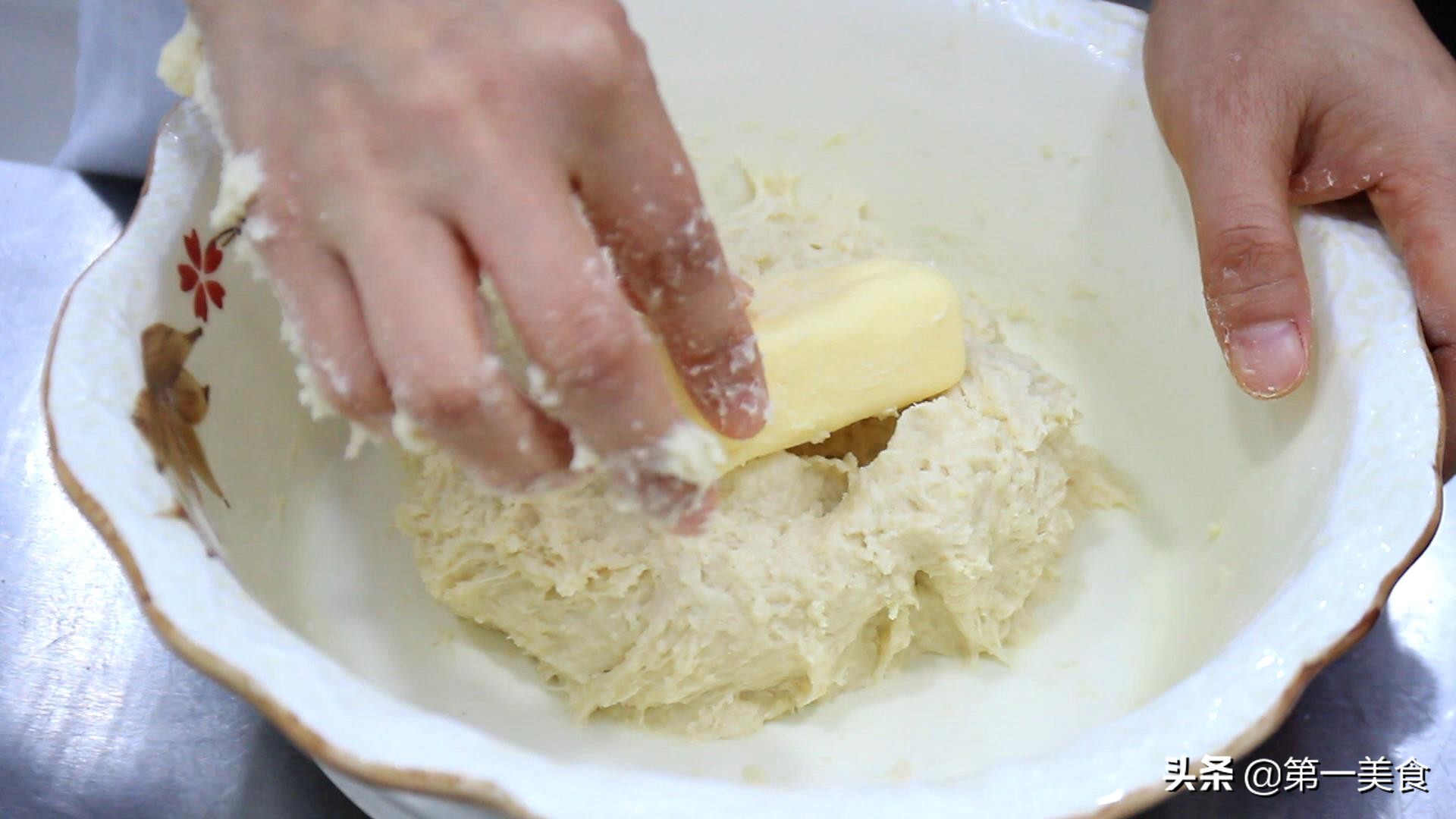 再和成稍微軟一點的面團,面團要多揉搓 ,一定要把面團揉出筋以后,加入軟化后的普通黃油30克。