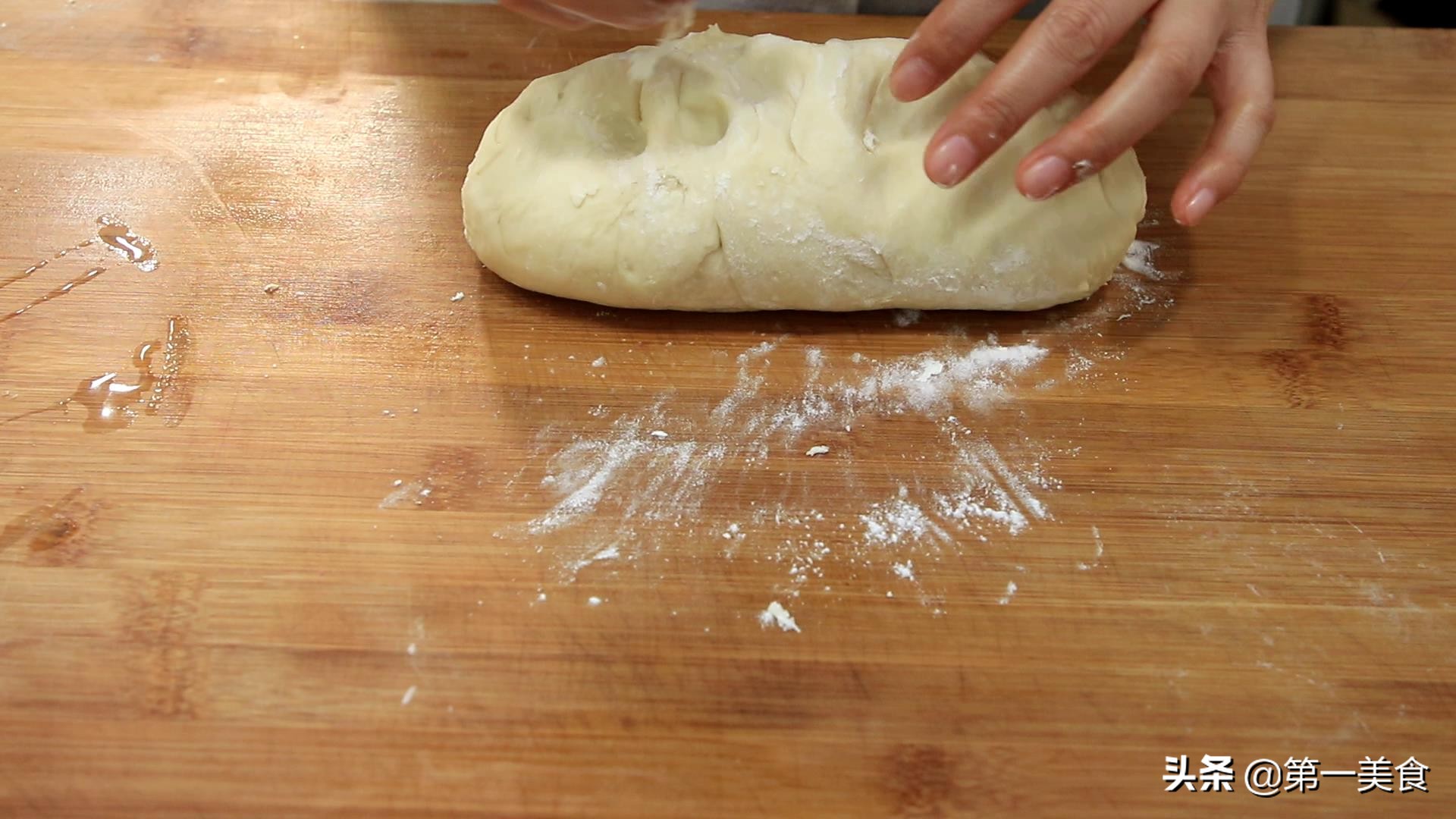 取出面團 ,放上案板上揉搓 ,給面團排一下氣,多揉搓一會, 要有足夠的耐心, 揉搓10來分鐘,使面團的內部組織更加均勻。