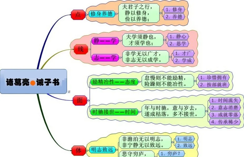 諸葛亮曾經寫給后人的一封信,盡管歷盡了一千八百多年;盡管只用了短短八十六字;但是,在今天的時代,一樣同樣適用,不僅僅對家庭教育,而且對成人統一適用!!真正的智慧,可以超越時空,歷久彌新!下面用思維導圖進行解剖學習,了解其“點線面體”之格局。