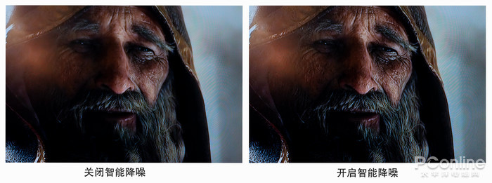 此外,還有智能降噪解析功能,能夠智能提升畫面的清晰度,我們在播放1080P片源時開啟和關閉降噪功能,可以看到開啟后畫面清晰度和銳度明顯提升,人物皮膚的紋理更加清晰。