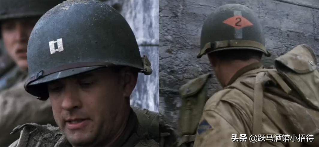 注意看米勒上尉的M1頭盔,正面的條形方塊是尉官的標志,背面的菱形和數字代表他們來自游騎兵二營。