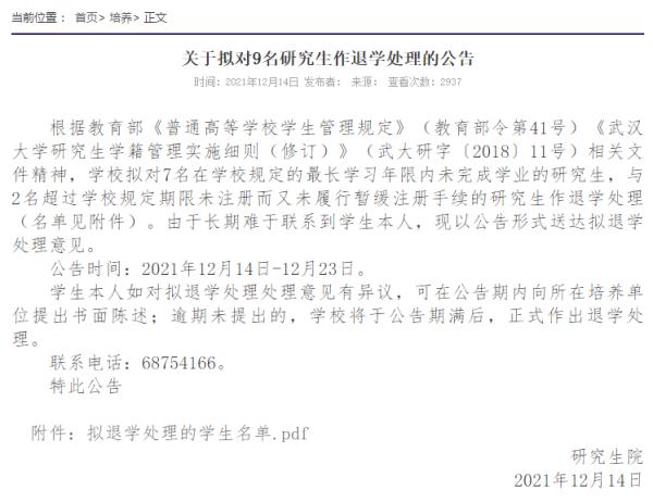 武大研究生院發布的公告顯示:根據教育部《普通高等學校學生管理規定》(教育部令第41號)《武漢大學研究生學籍管理實施細則(修訂)》(武大研字〔2018〕11號)相關文件精神,學校擬對7名在學校規定的最長學習年限內未完成學業的研究生,與2名超過學校規定期限未注冊而又未履行暫緩注冊手續的研究生作退學處理。