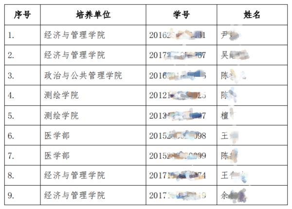 極目新聞記者下載擬作退學處理的學生名單發現,9名學生涉及5個學院(部),其中入學最早的是測繪學院2012級研究生陳同學,最晚的是3名2017級學生。