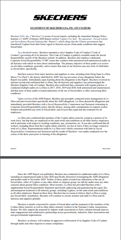 斯凱奇的聲明表示,在注意到澳大利亞戰略政策研究所(ASPI)等組織發布的涉疆報告后,公司聘請了專門的企業社會責任團隊,對全部與公司有直接聯系的工廠進行了公開和未公開的兩輪調查,“這些調查的主要目標是檢查當地勞工的狀況,確保我們的工廠不存在任何形式的雇傭童工或強制勞動行為”。