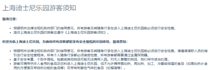 2019年9月,上海迪士尼度假區開始正式實施其主題樂園的食品攜帶新規。游客可攜帶供本人食用的食品及飲料進入上海迪士尼樂園,但不允許攜帶需加熱、再加熱、加工、冷藏或保溫的食品及帶有刺激性氣味的食品。