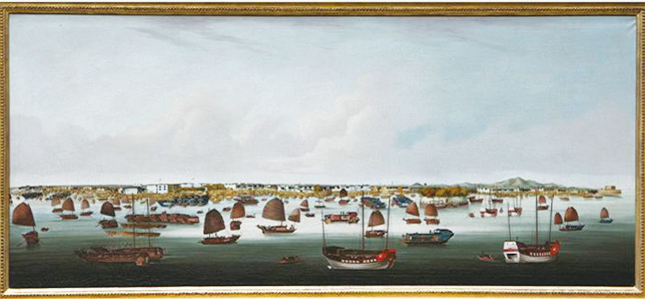 《廣州港全景圖》為煜呱代表作品,畫框背部上方有“Youqua”畫室標簽殘片。畫面描繪了從沙面、十三行商館區、海珠炮臺直至大沙頭附近的東水炮臺一帶珠江北岸的廣闊風景,以洋畫的技巧寫實地記錄了特定時期廣州的歷史風貌,是當時中國其他城市罕見的圖像記載,具有較高的歷史價值與藝術價值,堪稱清代廣州的手繪照片、珠江版的“清明上河圖”。