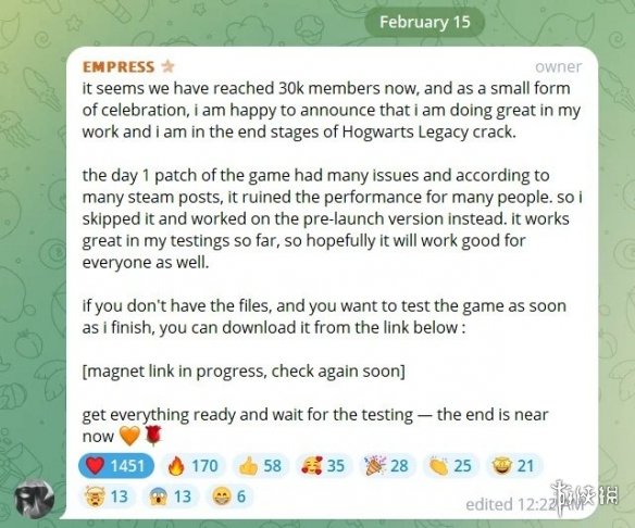 EMPRESS曾建議華納兄弟不要用D加密,會在十天內破解《霍格沃茨之遺》并將其傳播出去,讓每個人都能免費玩到這款游戲。