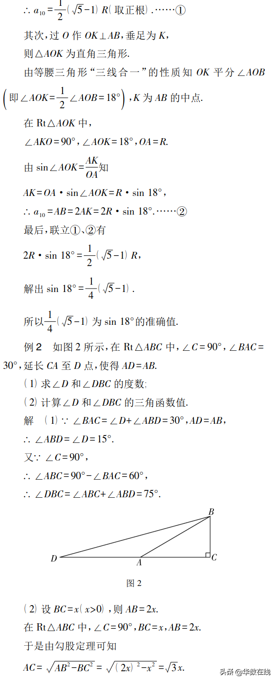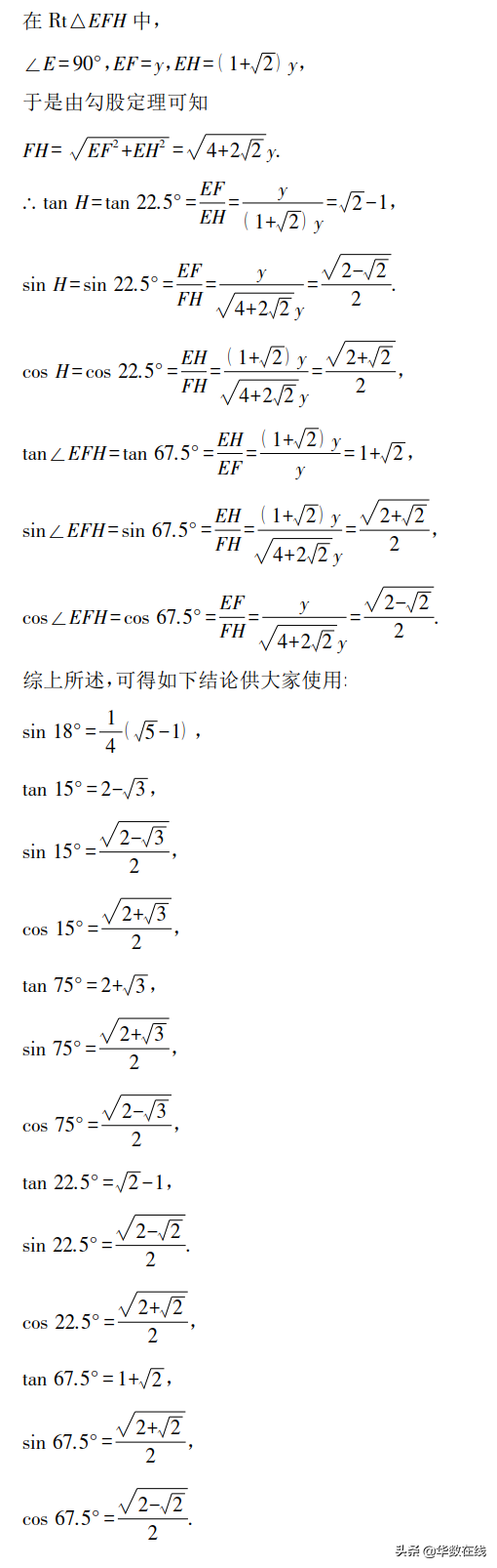 導讀因為18°、15°、75°、22.5°、67.5°的角不是特殊角,所以想要知道它們的一些三角函數值,對于初中生來說不像高中生那樣可以利用誘導公式解決,他們大多是用計算器或查三角函數表而獲得,但無論是借