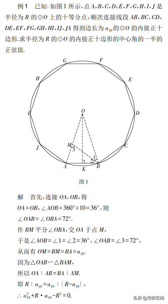 因為18°、15°、75°、22.5°、67.5°的角不是特殊角,所以想要知道它們的一些三角函數值,對于初中生來說不像高中生那樣可以利用誘導公式解決,他們大多是用計算器或查三角函數表而獲得,但無論是借助于計算器,還是用三角函數表所獲得的都是含四個有效數字的近似值,而我們有時候需要18°、15°、75°、22.5°、67.5°這些角的一些三角函數準確值,下面通過具體例子給出求18°、15°、75°、22.5°、67.5°角的一些三角函數的準確值的方法.
