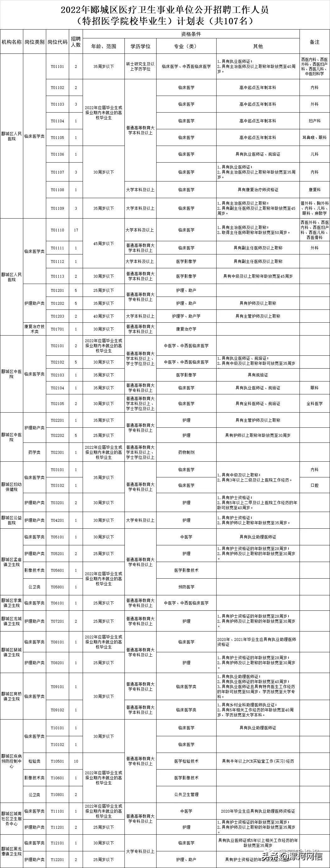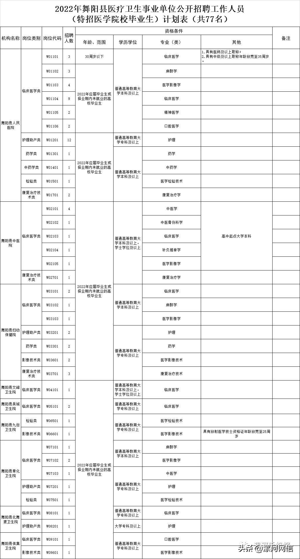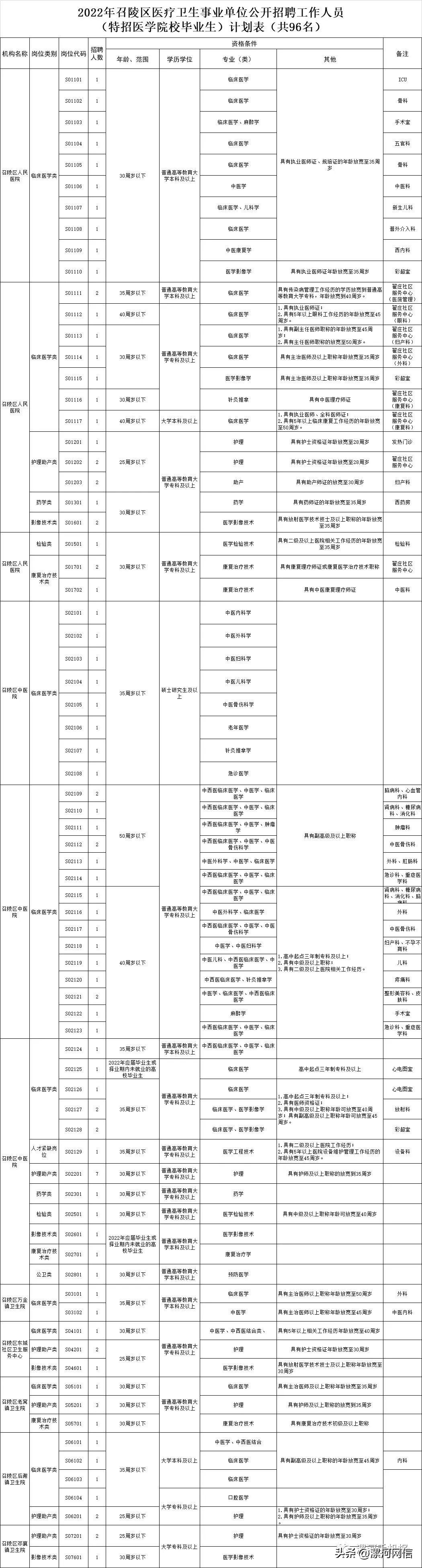 9月5日,市機關事業單位公開遴選招聘人員工作領導小組辦公室發布《2022年漯河市縣區醫療衛生事業單位公開招聘工作人員(特招醫學院校畢業生)簡章》。根據人員編制空缺情況和全省醫學院校畢業生特招計劃需求,漯河市縣區醫療衛生事業單位公開招聘工作人員和特招醫學院校畢業生共384名,其中,臨潁縣58名,舞陽縣77名,郾城區107名,源匯區46名,召陵區96名。