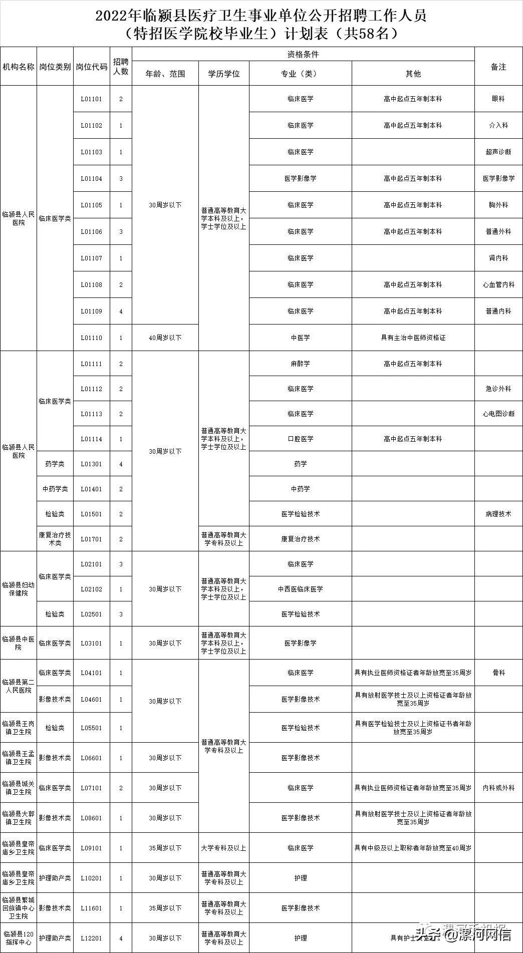 根據人員編制空缺情況和全省醫學院校畢業生特招計劃需求,漯河市縣區醫療衛生事業單位公開招聘工作人員和特招醫學院校畢業生共384名,其中,臨潁縣58名,舞陽縣77名,郾城區107名,源匯區46名,召陵區96名。