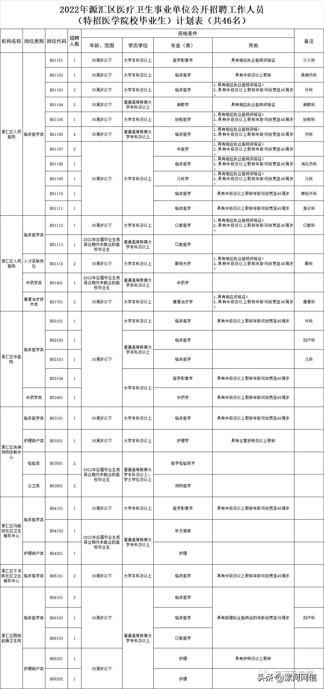 根據《事業單位人事管理條例》(國務院第652號令)、《河南省事業單位公開招聘工作規程》(豫人社〔2015〕55號)、《漯河市機關事業單位補充人員管理辦法》(漯編〔2014〕51號)等有關規定和要求,按照市委編委研究確定的補充人員計劃,經市機關事業單位公開遴選招聘人員工作領導小組研究決定,在符合新冠肺炎疫情防控相關要求的前提下,面向社會公開招聘縣區醫療衛生事業單位工作人員(特招醫學院校畢業生)。