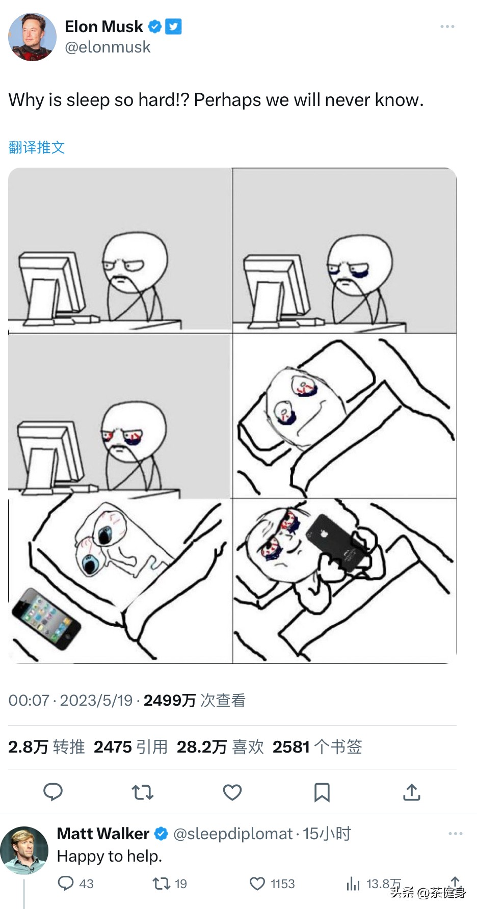 加州大學伯克利分校的神經科學教授、《我們為什么要睡覺》的作者馬修·沃克在下面給馬斯克留言:很高興,我能幫助你。他寫的這本有關睡眠的書,曾經是暢銷書排行榜的第一名,也是多家媒體的年度推薦書,比爾·蓋茨也曾大力推薦這本書。