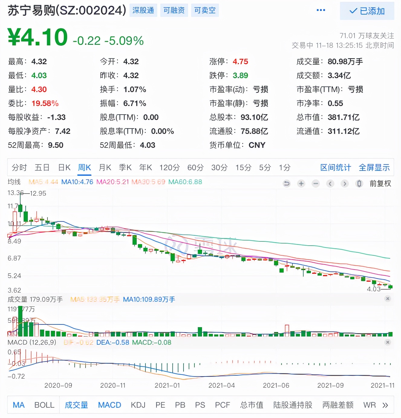 11月18日消息,電商巨頭蘇寧易購盤中繼續下行,早盤報4.03元/股,總市值380億元。