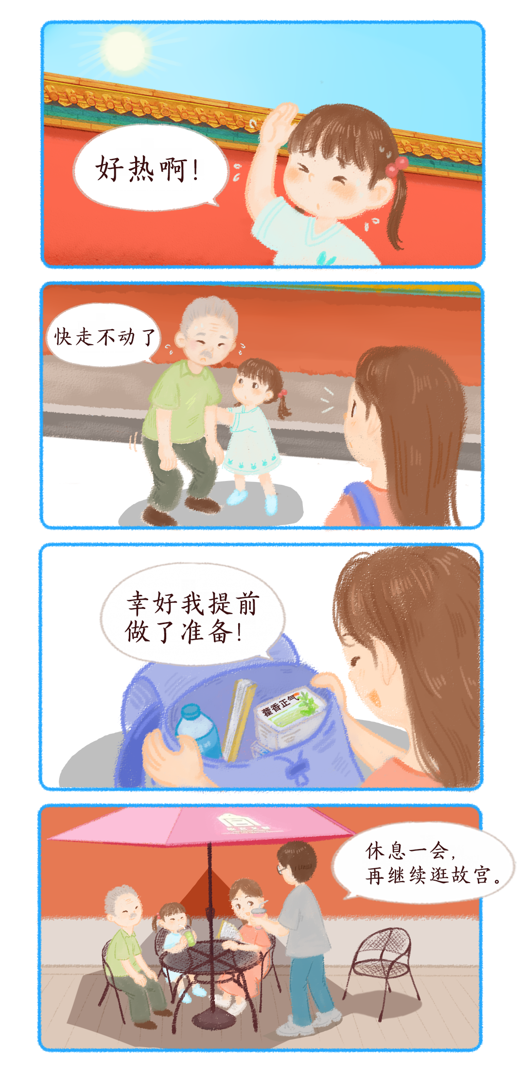 故宮博物院許多參觀區域處于露天環境,請您務必做好防暑準備,預備防暑藥品,攜帶遮陽設備,帶足冷飲,及時補水(小提示:防曬霜可以攜帶,但防曬噴霧屬于壓縮氣體,是禁止攜帶物品哦)。北京連日高溫酷暑,感謝大家對故宮的熱愛,但是我們仍然建議年長者、體弱者視身體情況盡量減少戶外活動,待天氣涼爽些再出游。參觀過程中若有身體不適,請盡快聯系附近的工作人員或撥打故宮急救站電話。