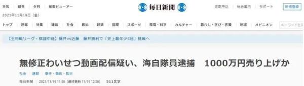 《每日新聞》:日本海上自衛隊員因涉嫌上傳無碼淫穢視頻被逮捕,獲利或超1000萬日元