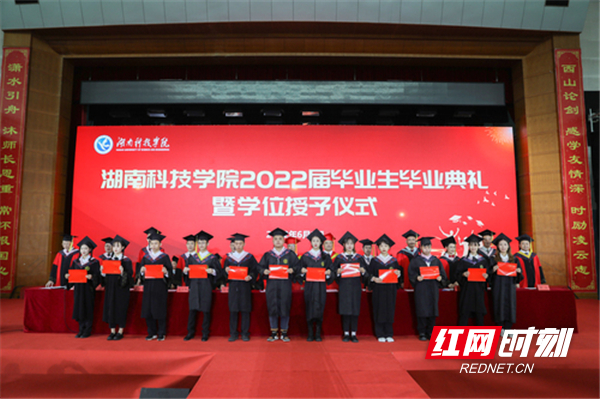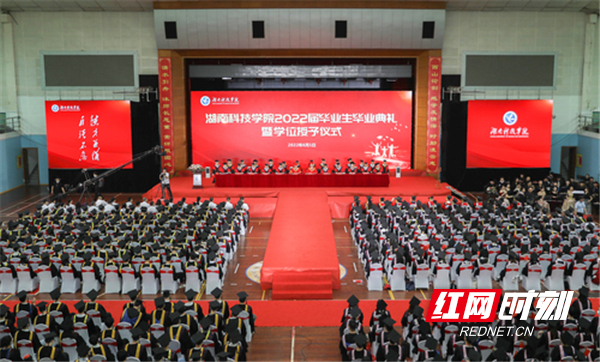 大會在莊嚴的國歌中拉開帷幕。黨委委員、副校長李常健宣讀《湖南科技學院關于2022屆本科生畢業及授予學士學位的決定》。黨委副書記宋宏福宣讀《關于表彰湖南省普通高等學校2022屆優秀畢業生和創新創業優秀畢業生的通報》。166名學生被授予“湖南省普通高等學校2022屆優秀畢業生”“湖南省普通高等學校2022屆創新創業優秀畢業生”。