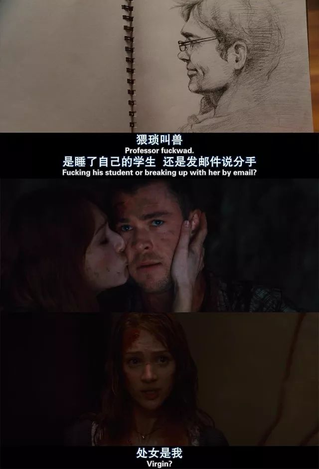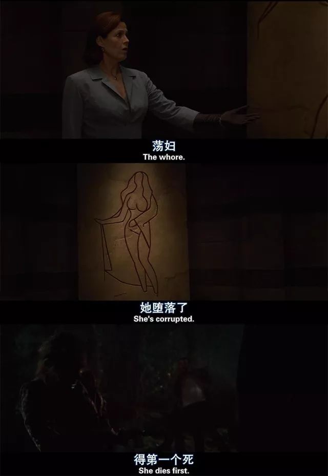 [林中小屋]結尾,西格妮·韋弗特意強調:蕩婦第一個死,這點幾乎是經典美式恐怖片的固定套路,電影一絲不