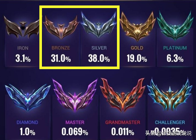 近日,外媒某數據網站,更新了最新的全球服務器,英雄聯盟玩家段位統計數據。從這份數據可以明顯看到,從全球段位來看,主流的段位只有三個,那就是黃銅(31%),白銀(38%)和黃金(19%)。入門級別的黑鐵段位,玩家比例反而很少,只有3%左右。如果把低段位的玩家都統計進去,黑鐵+黃銅+白銀段位的玩家,占比高達72%。