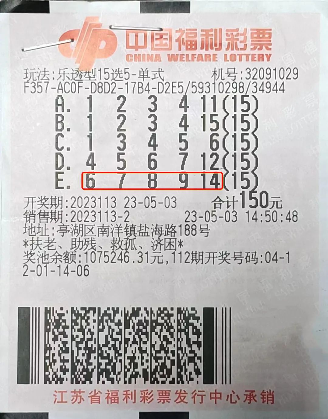 導讀5月3日晚,福彩15選5游戲進行第2023113期開獎,當期開出的號碼為06 07 08 09 14。幸運的是,一位購買了15倍投注的彩民在32091029福彩站點中了大獎。▲中獎彩票據了解,這位中