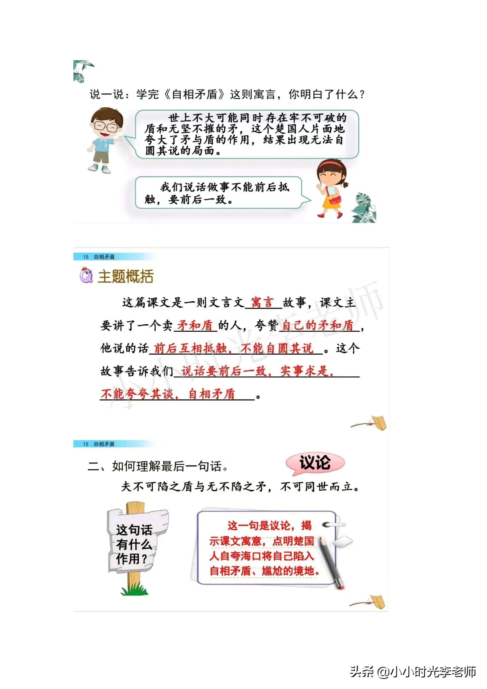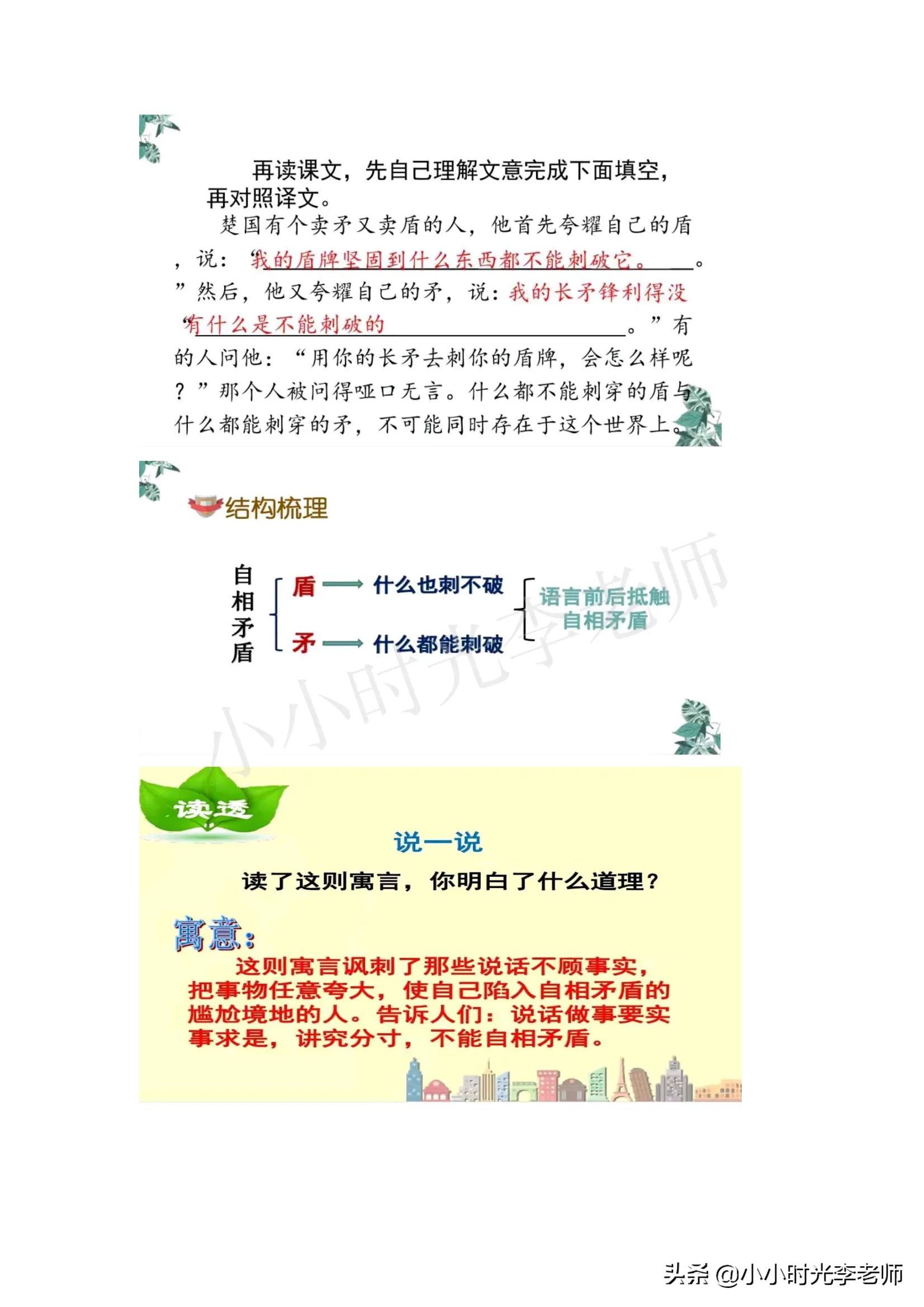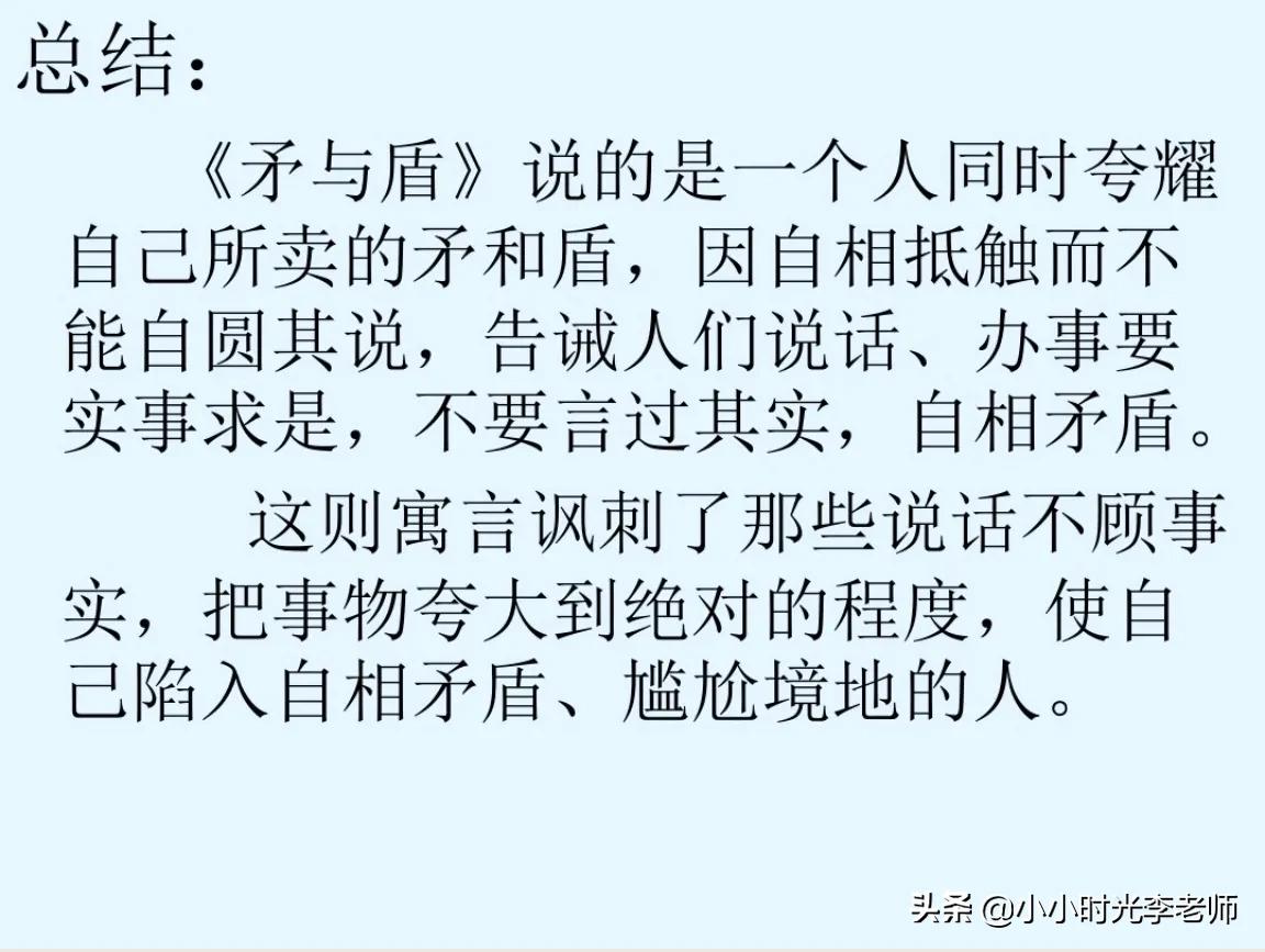 《矛與盾》說的是一個人同時夸耀自己所賣的矛和盾,因自相抵觸而不能自圓其說,告誡人們說話、辦事要實事求是,不要言過其實,自相矛盾。