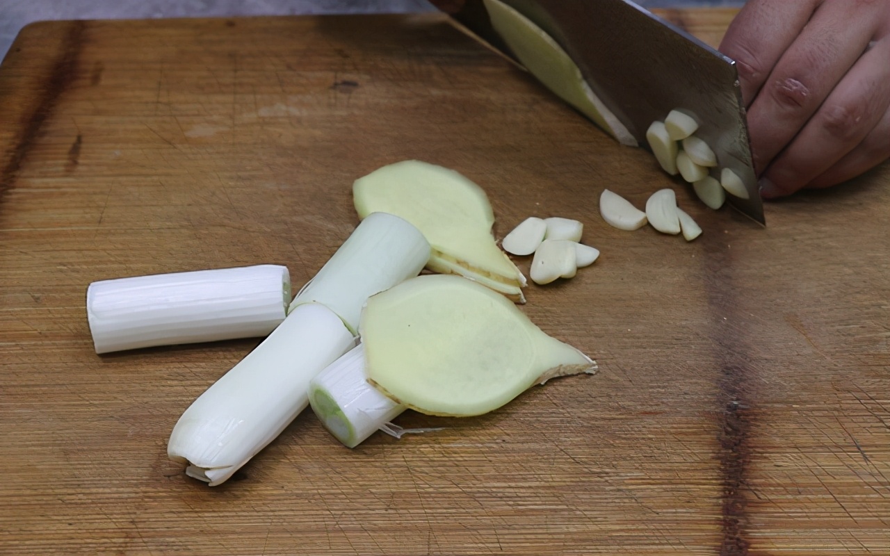 第三步:大蔥切成段,生姜切成片,大蒜切成厚片。然后往腌制好的魚頭魚骨中加入清水,并多次抓洗,充分抓洗干凈,最后撈出來控干水分。
