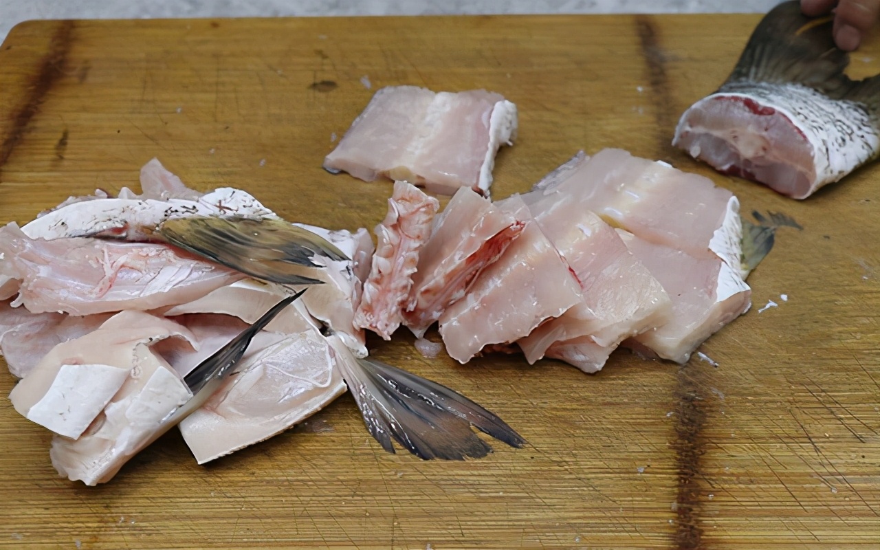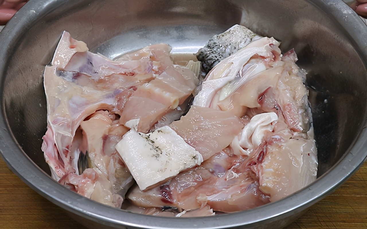 第一步:花鰱清洗干凈后從魚尾處下刀,片下魚肉,在魚的后腦勺處切斷;然后片下魚肚上的大刺,再把魚肉、魚骨剁成大塊,魚頭對半劈開,并在魚肉上劃兩刀以方便入味。