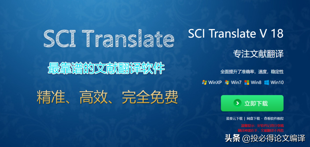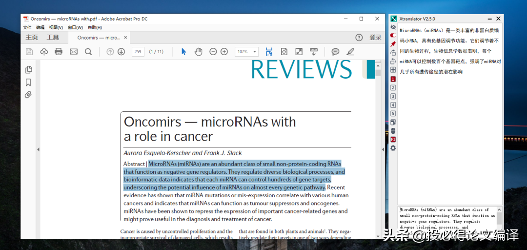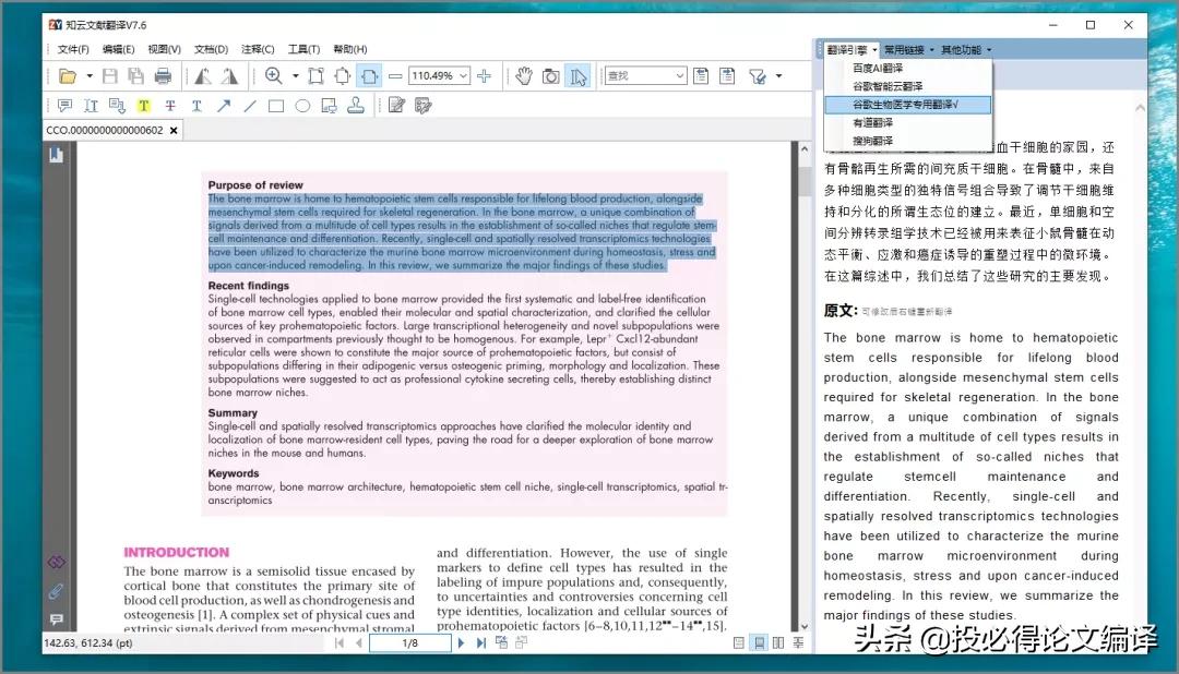 速度快,翻譯準,全免費,軟件小巧,是研究生科研人員都非常喜歡的文獻翻譯神器。使用方法非常簡單,只需要用該軟件打開PDF格式的英文文獻,選中某句話或者某個段落,即可實現英文翻譯,有多種翻譯引擎可供選擇,特別是有專用的生物醫學翻譯引擎,保證了專用術語翻譯的準確性。