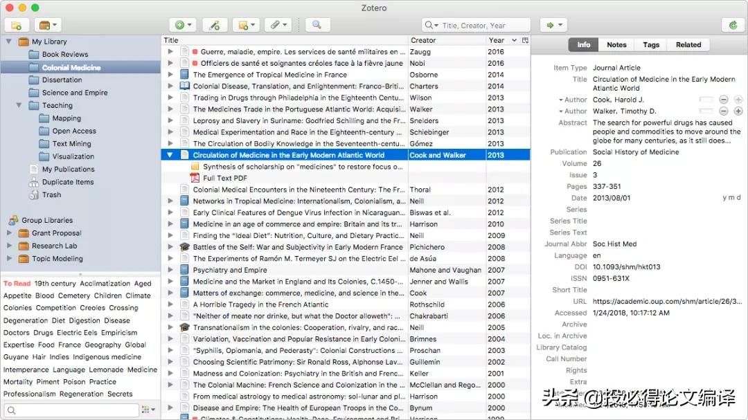 Zotero是由“羅伊茨歷史與新媒體中心”開發的一款自由并開放源代碼的文獻管理軟件。它的管理能力不僅僅是對于文獻,而是涉及書籍、專利、百科以及新聞。好用還免費,具有諸多功能與亮點,如:免費開源、導入文獻方便、跨平臺實時同步、軟件輕便、支持插件擴展實現更多功能、支持Rss訂閱等。