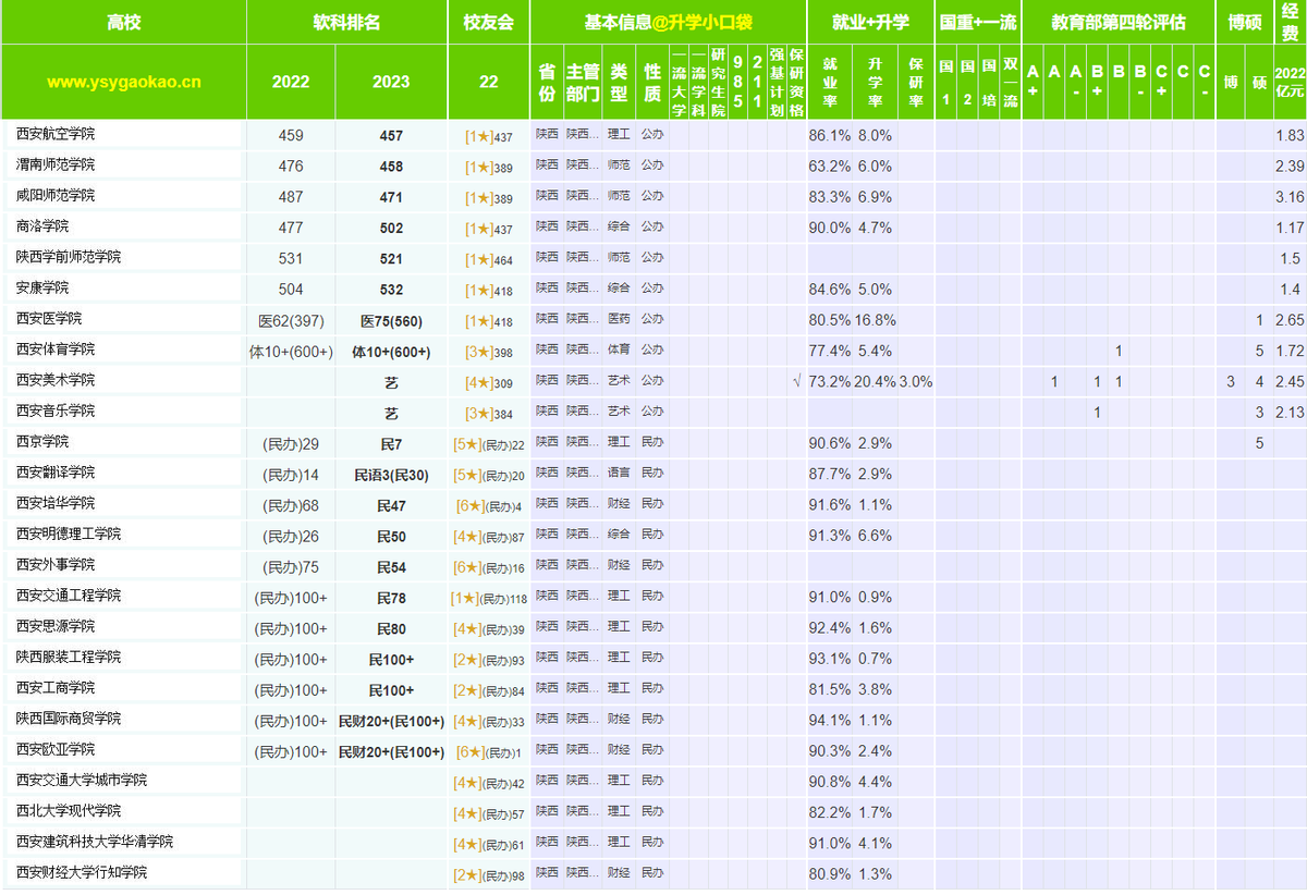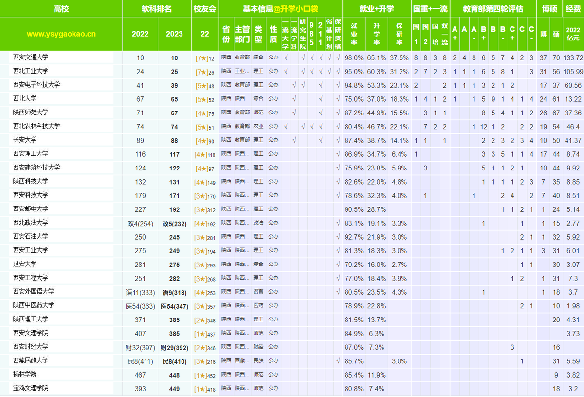 從學校的綜合實力排名來看,西安電子科技大學,西北大學和陜西師范大學的綜合排名超過了西北農林科技大學。從本科生的升學數據來看,西安交通大學和西北工業大學每年畢業的本科生中,選擇繼續讀研的學生人數占總人數的比例超過60%。西安電子科技大學本科生的升學率約為53.3%。陜西師范大學,西北農林科技大學本科生的升學率超過40%。長安大學和西北大學本科生的升學率超過35%。