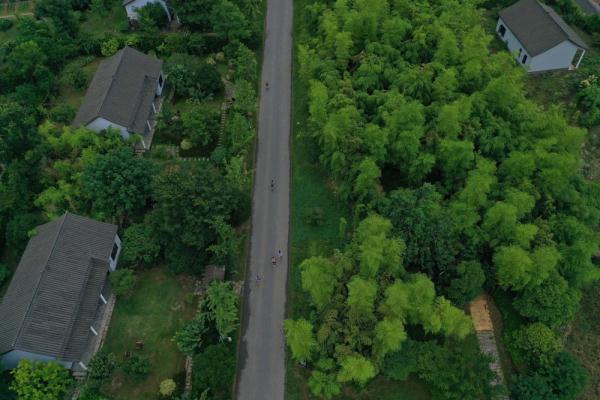 ↑6月17日,參賽選手在比賽中經過一段梅林棧道(無人機照片)。