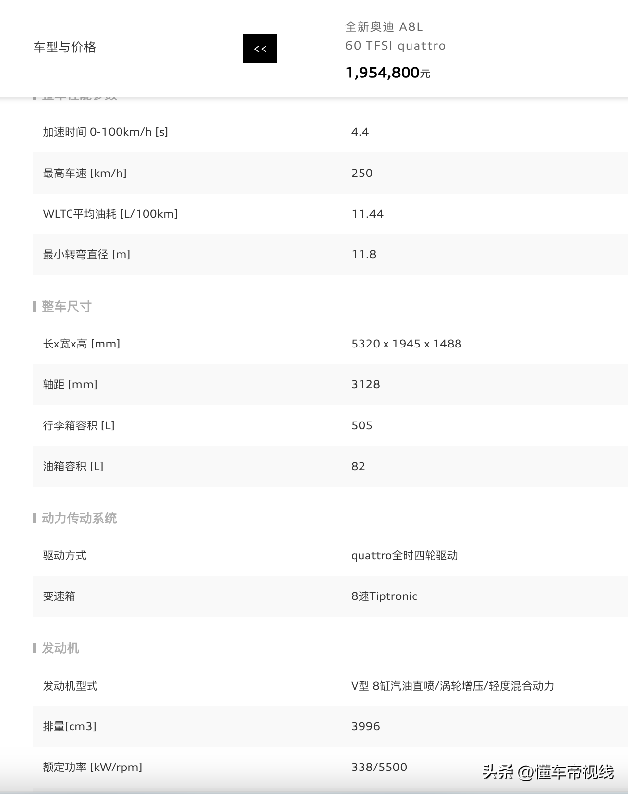 現款奧迪A8L 60TFSI quattro 動力信息