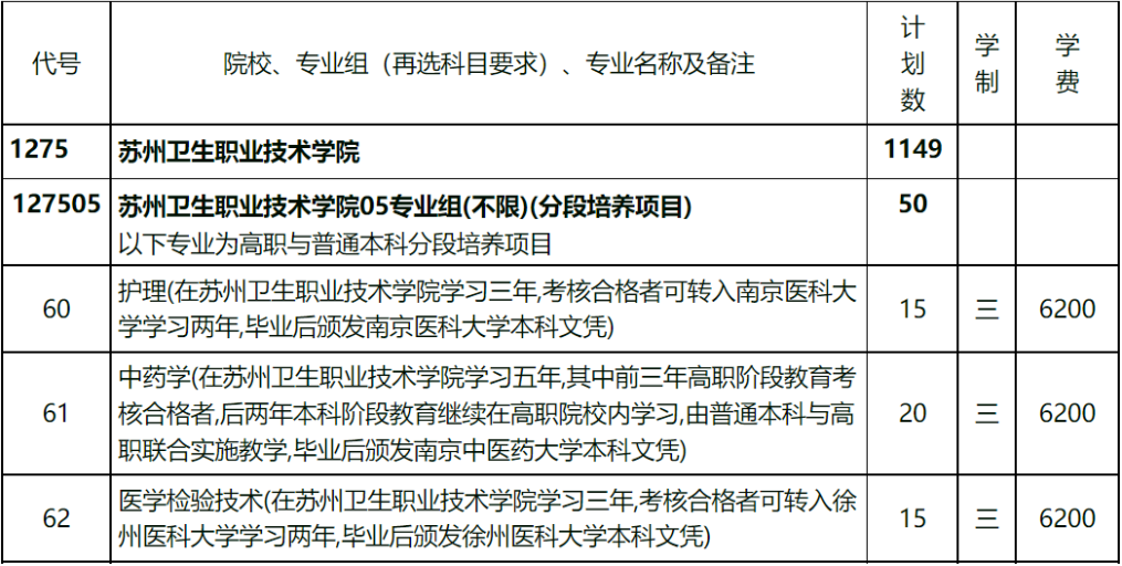 2022年蘇州衛生職業技術學院“3+2”分段培養項目共計劃招生100名,具體招生計劃如下: