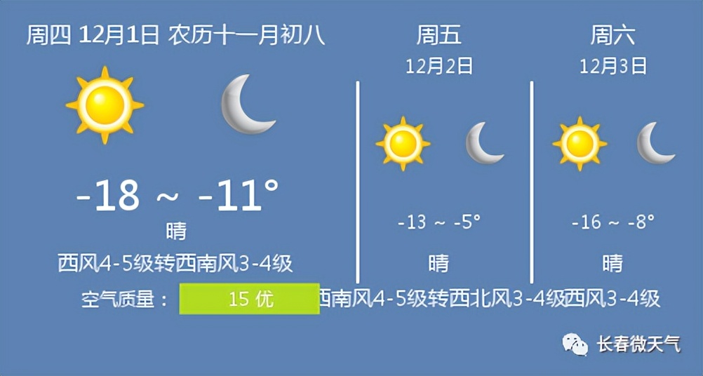 早上好,今天是12月1日,星期四,農歷十一月初八,今日艾滋病日。長春天氣:晴,溫度 -18 ? -11℃,西風4-5級轉西南風3-4級,日出時間 06:52,日落時間 16:02,降雨量 0.0mm,濕度 33%RH。實時:晴,氣溫 -16℃,西南風5級,濕度 47%RH,氣壓 1003Pa,紫外線強度 1級,能見度 12500米。