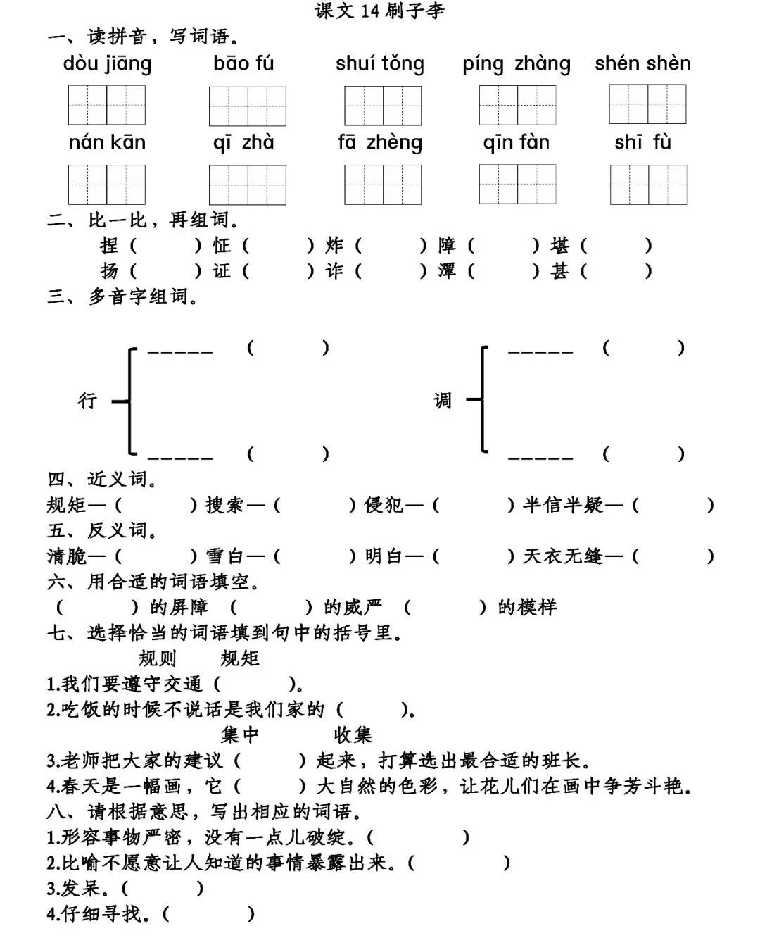 捏(捏造)怔(發怔)炸(煎炸)障(屏障)堪(難堪)