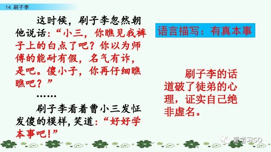 “刷子李”對徒弟說的這句話是意味深長的。他告訴徒弟曹小三,不要以為別人的名氣都是虛的,那可是名副其實的。他教育徒弟要好好學本事。手藝人必須有本事,本事是勤學苦練出來的,有了本事才能有自己的尊嚴。這句話貌似一般,但是在課文里有很深的含義。