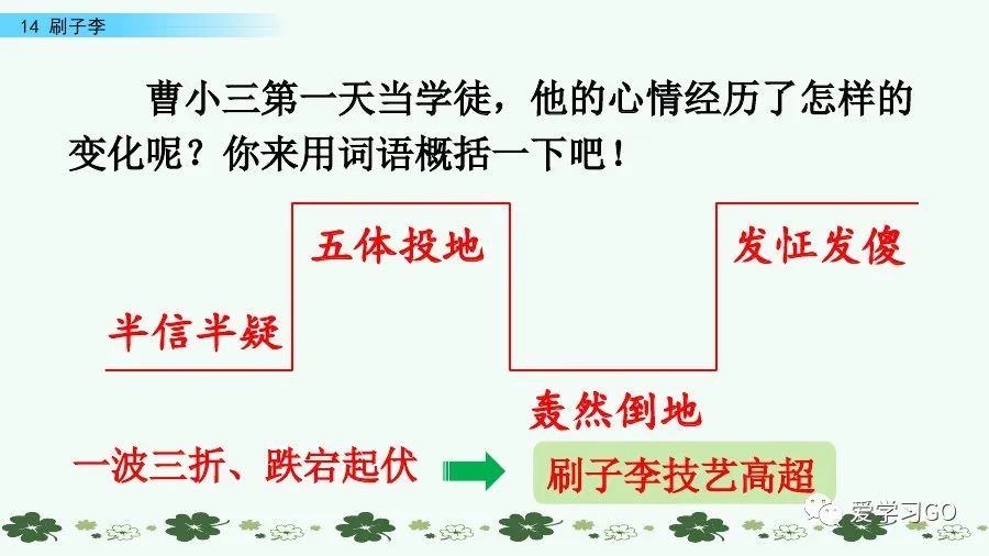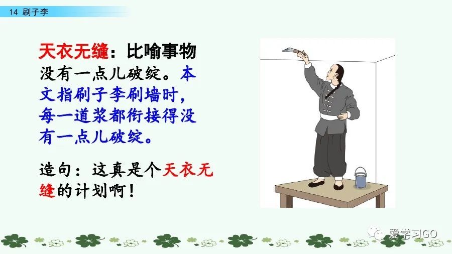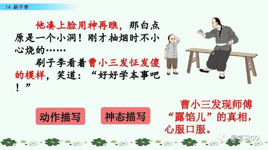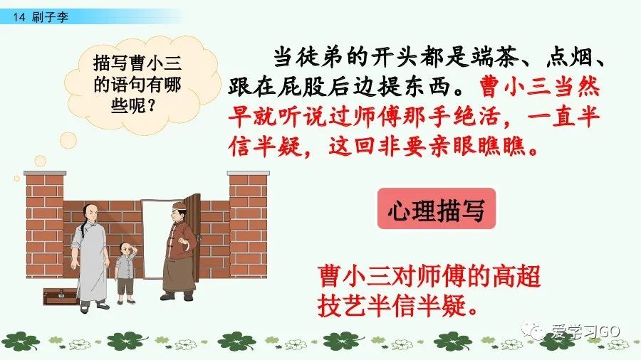 “刷子李”收曹小三為徒,為下文故事的展開做了鋪墊。下文以曹小三的所見、所聞、所思、所感為線索,具體描寫“刷子李”是怎樣粉刷墻壁的,增強了說服力,使人物形象更加飽滿。