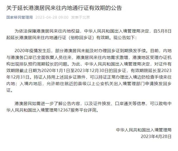 央視網消息:據國家移民管理局,4月28日,中國出入境管理局發布關于延長港澳居民來往內地通行證有效期的公告。